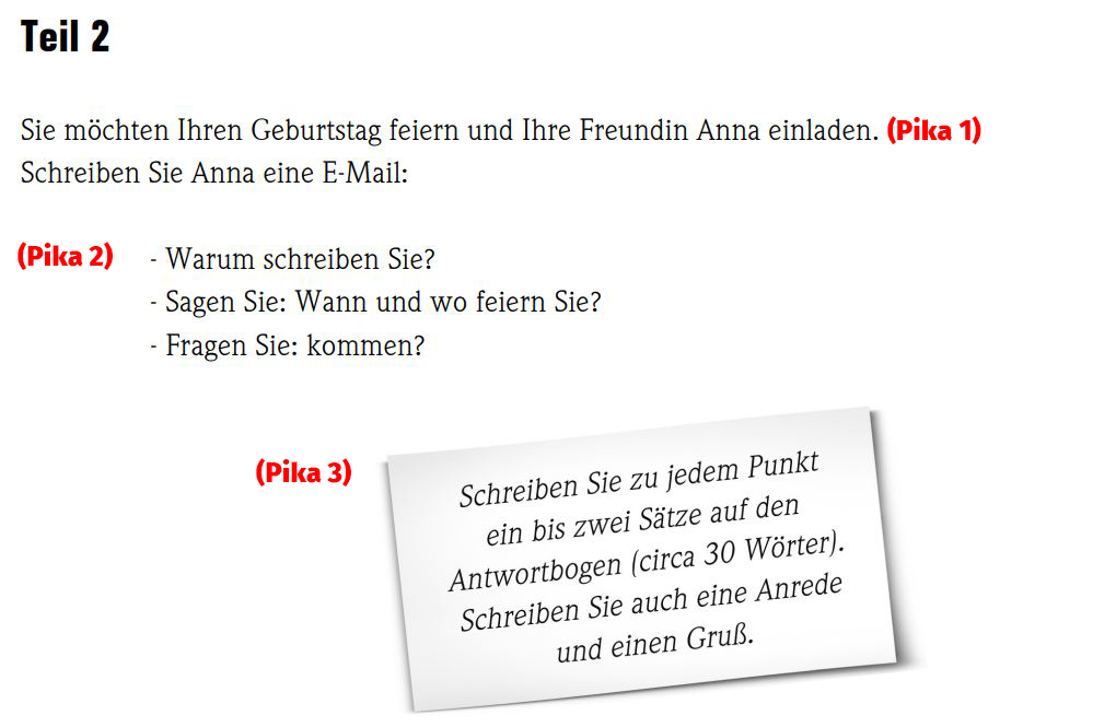 Sipas Pikës 3 rregullat që duhet të kemi parasysh gjat shkrimit janë: Për piken e 2 për secilin numër të shkruajmë një ose dy fjali. Përafërsisht 30 fjalë. Të shkruajmë thirrjen për personin (d.m.th. Liebe, Lieber, Sehr geehrter, Hallo …) dhe në fund përshëndetjen (Grüße, Mit freundlichen Grüßen …).